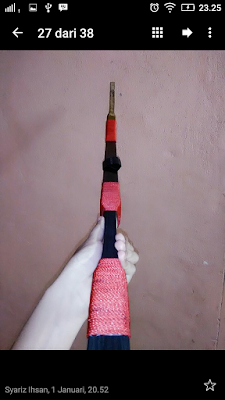 Foto di bawah ini dia kirimkan pada hari selanjutnya. sudah dipasang string/talinya. menggunakan tali dengan diameter 6mm, padahal saya menyarankan menggunakan tali 4mm, tapi katanya... tali ini melar dan kalo dipasang, akan menjadi 4mm. hehe...